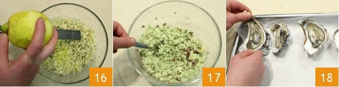 aromatiza con la ralladura de limón 16 y mezcla con una cuchara de madera para amalgamar los ingredientes 17. Forra una bandeja con papel de horno y para que las conchas queden estables, que de otro modo podrían volcarse, coloca debajo de cada concha un anillo realizado con una hoja de papel de aluminio 18, de esta manera las ostras permanecerán bien derechas en la cocción.