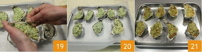 En este punto cubre las ostras con el empanado 19, cuando hayas rellenado todas las ostras 20 rocíalas con un hilo de aceite y luego gratina en horno precalentado estático a 250° por 10-15 minutos o en horno ventilado a 220° por 10 minutos. si deseas los últimos dos minutos puedes cocerlas bajo el grill hasta que el empanado esté bien dorado. Tus ostras gratinadas con anchoas y alcaparras de Pantelleria están listas, sácalas del horno y sírvelas inmediatamente 21.