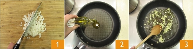 Para preparar los paccheri berenjenas y ricotta, comience poniendo a hervir el agua que se utilizará para la pasta, a la que añadirá sal al hervir. Limpie y pique la cebolla 1, luego vierta el aceite en una sartén amplia y caliéntelo 2. Agregue la cebolla 3 y sofríala, mezclando de vez en cuando para dorarla y pocharla suavemente.