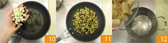 Caliente un poco de aceite en una sartén, añada las berenjenas 10 y sofríalas hasta dorarlas 11. Ponga una olla de agua con sal al fuego y cueza los paccheri 12, dejándolos dos minutos menos.