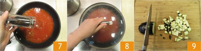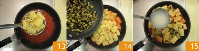 Escurra los paccheri directamente en la salsa de tomate 13, añada las berenjenas 14, mezcle y termine la cocción añadiendo agua de cocción de la pasta 15 poco a poco si es necesario.