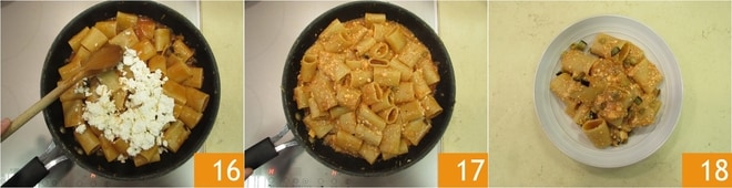 Cuando los paccheri estén cocidos, apague el fuego y añada la ricotta 16, mezcle para integrarla 17 y perfume con hojas de albahaca. Los paccheri berenjenas y ricotta están listos para ser servidos 18.