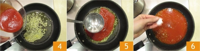 Vierta el puré de tomate 4, añada un cazo de agua caliente 5 y ajuste de sal 6.
