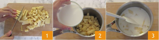 Para preparar los paccheri con achicoria y fonduta de fontina, comienza con la fonduta: elimina la corteza del queso y córtalo en cubos bastante pequeños 1, luego transfiérelos a un cazo y añade la leche 2. Déjala reposar a temperatura ambiente durante aproximadamente 2 horas o hasta que el queso esté suave y casi gelatinoso 3.
