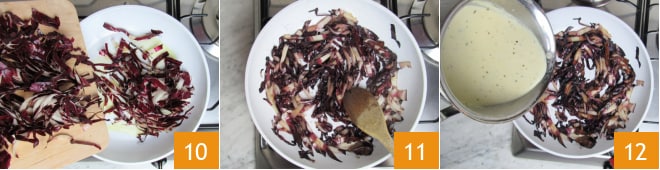 Mientras tanto, calienta un poco de aceite en una sartén, añade la achicoria 10 y deja que se ablande durante unos 5 minutos 11, luego apaga el fuego. Cuando la fonduta esté lista, viértela aún caliente en la sartén con la achicoria 12.