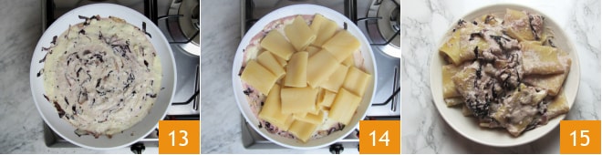 Mezcla bien para amalgamar la achicoria con la fonduta 13, luego escurre los paccheri y añádelos en la sartén 14. Mezcla, ajusta de sal y pimienta y sirve inmediatamente tus paccheri con achicoria y fonduta de fontina 15.