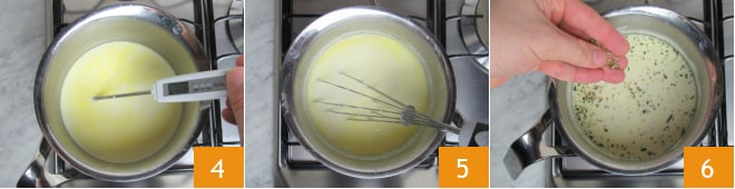 Pasado el tiempo de remojo, coloca el cazo al fuego a llama baja: para asegurar un buen resultado usa un termómetro para verificar que la leche alcance una temperatura entre los 65° y 75° 4. Mezcla constantemente con un batidor para amalgamar la mezcla de manera homogénea 5, luego agrega el romero picado y el orégano 6.