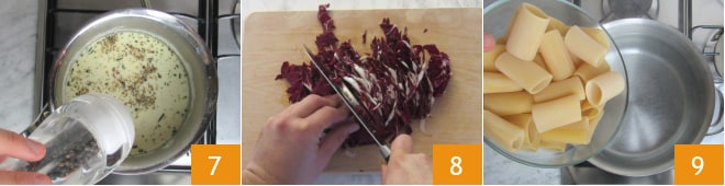 Sazona con la pimienta 7 y continúa mezclando a fuego suave: la fonduta deberá cocinarse en total durante unos 10-15 minutos, hasta que todo el queso se haya derretido y tenga una consistencia densa. Mientras tanto, corta la achicoria en tiras 8 y pon al fuego una olla de agua para salar al hervir. Vierte los paccheri en el agua hirviendo 9 y cocina durante el tiempo indicado en el paquete.