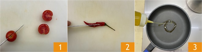 Para preparar los paccheri con anchoas y tomates cherry, cortad los tomates cherry por la mitad 2, haced una incisión y dividid a la mitad también el chile 2. En una sartén verted un poco de aceite de oliva virgen extra 3.
