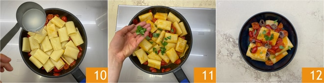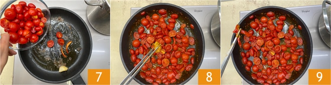 Una vez que las anchoas estén disueltas, añadid los tomates cherry 7, cocinad durante 10 minutos, luego quitad el ajo 8 y el chile 9.