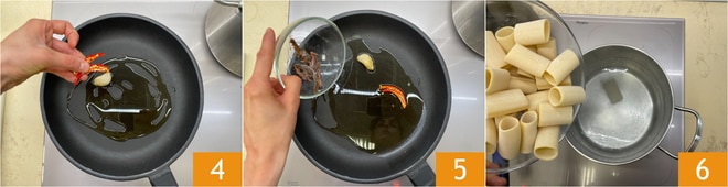 Sazonad con ajo, chile 4 y anchoas 5; dejad que las anchoas se disuelvan suavemente. Mientras tanto, hervid los paccheri en agua con sal 6.