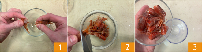 Para hacer los paccheri con gorgonzola y pimienta con gambas rojas, lo primero es limpiar las gambas reservando la cabeza 1 y quitando el caparaz n y el tracto intestinal. Eliminad los ojos con unas tijeras 2 y poned las cabezas en un vaso alto 3. <\/p>