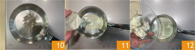 Tostad la pimienta molida en una sart n a fuego bajo durante unos minutos 10. Ocupaos de la salsa: en un cazo verted la nata 11 y el gorgonzola 12.<\/p>