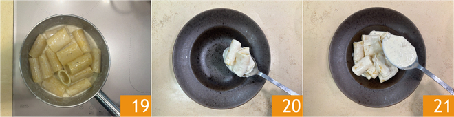 Saltead a fuego medio para llevar la pasta a punto y dejarla bien cremosa 19. Emplatad los paccheri 20 con la salsa de gorgonzola 21. <\/p>