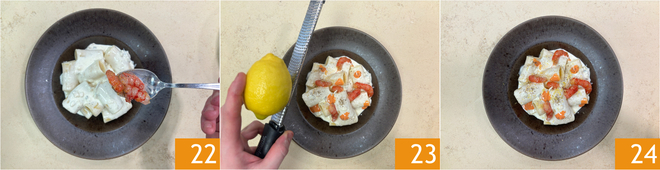 Completad con las gambas rojas 22, la ralladura de lim n 23, unas gotas de la crema de gambas y la parte restante de la pimienta tostada. Los paccheri con gorgonzola y pimienta con gambas rojas est n listos para servir 24.<\/p>