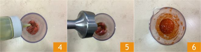 A adid el aceite 4 y triturad con la batidora de mano 5 para crear una emulsión 6. <\/p>