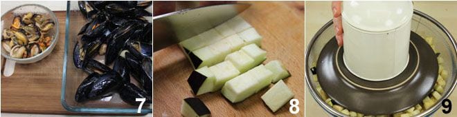 En este punto, sacad las conchas de la mitad de los mejillones y dejad la otra mitad entera para la decoración final del plato 7. Limpia las berenjenas quitando los extremos, córtalas en cubos 8 y colócalas en capas en un colador o tamiz, espolvoreándolas con sal gruesa. Cúbrelas con un peso para que la presión ayude a perder el agua y el amargor, y déjalas reposar así durante al menos una hora 9.