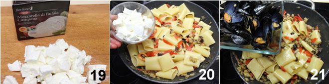 Cortad en trozos una mozzarella de búfala 19 y añadidla a la pasta 20, luego agregad los mejillones restantes con la concha y abundante perejil 21. Mezclad bien todos los ingredientes y estáis listos para servir en la mesa vuestros paccheri con berenjenas, mejillones y mozzarella de búfala.