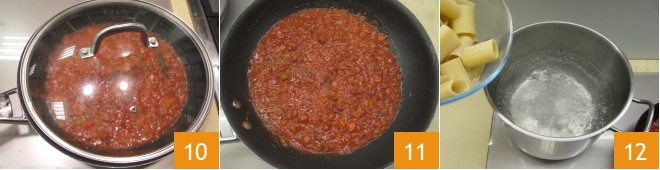 Continuad la cocción con la tapa durante unos 30 minutos 10. Una vez que el ragú esté listo, deberá estar bastante reducido 11. Pon agua a hervir en una cazuela grande, sal y cuece los paccheri 12.