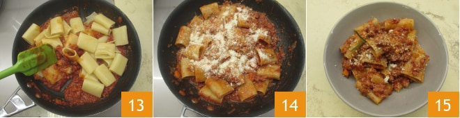 Escurridlos directamente en la sartén con el condimento 13, luego saltead a fuego alto y mezclad con Grana Padano DOP 14. Añadid agua de cocción si es necesario, mezclad de nuevo, apagad el fuego y servid vuestros paccheri con ragú de cotechino bien calientes 15.