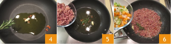 Calentad en una sartén grande el aceite de oliva virgen extra, luego sumergid el chile fresco entero, el ajo entero pelado y el romero 4. Después de sofreír durante 2-3 minutos, removiendo de vez en cuando, añadid el cotechino en dados 5 y subid el fuego para cocinar a fuego medio-alto, removiendo siempre de vez en cuando. Después de otros 3 minutos, añadid el picado de apio, zanahoria y cebolla 6 y continuad removiendo, dorando bien los ingredientes en la sartén.