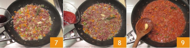 Pasados 5 minutos podéis desglasar con el vino 7 y dejar que se evapore, antes de añadir también el puré de tomate 8. Mezclad, bajad el fuego y quitad el ajo 9.