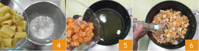 Cuando el agua esté hirviendo, añadid sal y echad los paccheri, que deberán cocinarse durante unos 20 minutos o el tiempo indicado en el paquete 4. Mientras la pasta se cocina, sofreíd el ajo en el aceite en una sartén grande, luego añadid el salmón 5. Añadid sal, pimienta 6 y cocinad a fuego alto durante 2-3 minutos, removiendo suavemente para no romper los cubos.