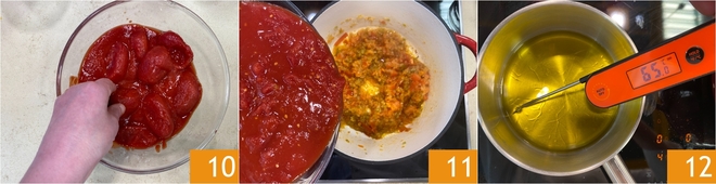 Tritura los tomates pelados 10 y viértelos en el sofrito 11, mezcla y cocina a fuego lento durante unos 50 minutos, hasta que la salsa esté reducida y espesa. Mientras tanto, prepara el aceite de albahaca: calienta el aceite a unos 65°C durante 5 minutos, controlando la temperatura con un termómetro para alimentos 12.