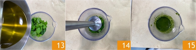 Vierte el aceite caliente sobre las hojas de albahaca fresca recogidas en el vaso de la batidora 13, luego bate con la batidora de inmersión 14 hasta obtener un aceite verde y fragante 15.