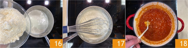 Pasa ahora a la fondue de Parmigiano: calienta la nata en un cazo sin llevarla a ebullición e incorpora gradualmente el Parmigiano Reggiano rallado 16, mezclando con un batidor 17 hasta obtener una crema suave y aterciopelada. Mantenla caliente. Cuando la salsa esté lista, retira el diente de ajo 18.
