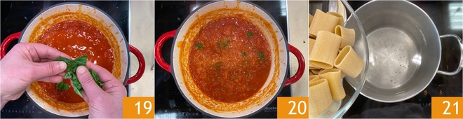 Perfuma con albahaca fresca desmenuzada directamente con las manos 19; mezcla y deja que tome sabor unos momentos más 20. Lleva a ebullición abundante agua con sal y cuece los paccheri 21 hasta que estén al dente.