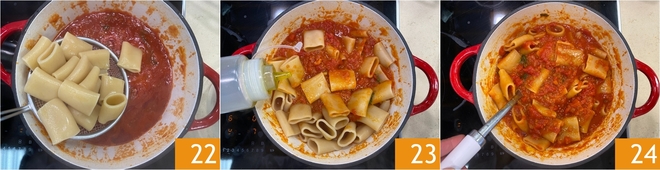 Escúrrelos y transfiérelos directamente a la cacerola con la salsa 22. Añade un chorrito de aceite 23 y saltea brevemente la pasta, mezclando para que tome sabor y se ligue bien al condimento 24.