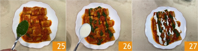 Sírvelos colocando los paccheri en el plato, completa con unas cucharadas de aceite de albahaca 25 y finalmente decora con la fondue de Parmigiano 26. ¡Sirve inmediatamente los paccheri con salsa falsa bien calientes 27!