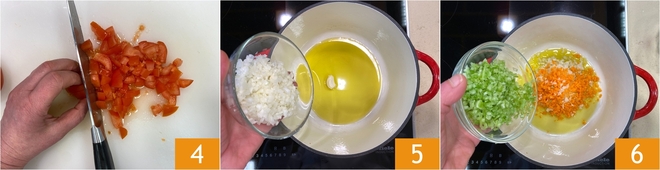 Corta entonces los tomates frescos en trozos 4. En una cacerola grande calienta el aceite de oliva virgen extra y añade un diente de ajo aplastado, luego añade la cebolla picada 5, la zanahoria y el apio 6 y sofríe a fuego lento hasta que las verduras estén blandas y translúcidas.