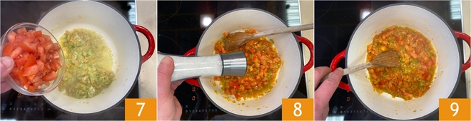 Añade los tomates frescos en trozos 7 y déjalos rehogar, luego ajusta de sal 8 y pimienta. Mezcla bien, dejando que todo tome sabor hasta que la base quede bien integrada 9.