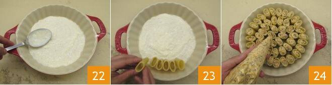 Coloca la mitad de la bechamel en el fondo de una fuente circular (o una bandeja) de 22 cm de diámetro en la base 22 y coloca los paccheri uno al lado del otro en círculos concéntricos comenzando por el perímetro exterior de la fuente, llenándola de esta manera 23. Rellena los paccheri con la mezcla de setas y salchicha que has transferido a la manga pastelera 24,