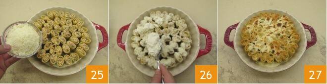 espolvorea con el resto del parmesano 25, luego añade el resto de la bechamel 26 y algunas hojas de tomillo. Cocina los paccheri rellenos en el horno precalentado a 180° durante unos 25 minutos + 5 minutos de grill para dorar la superficie. Saca los paccheri rellenos con salchicha y setas del horno, déjalos reposar y compactar durante 5-10 minutos y luego sírvelos en la mesa 27.