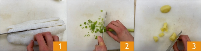 Para preparar los paccheri rellenos de bacalao sobre fondue de queso, comenzad por limpiar el pescado: colocad el bacalao desalado sobre una tabla de cortar y quitad con cuidado la piel ayudándoos con un cuchillo afilado. Eliminad cualquier espina con unas pinzas y luego cortad el bacalao primero en tiras 1 y luego en cubos regulares. Limpiad el cebolleta eliminando la base y la parte verde más dura, luego cortadla en rodajas finas 2. Pelad las patatas y cortadlas en cubos 3.