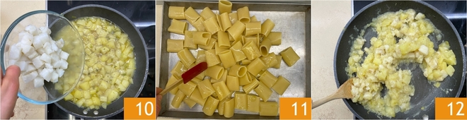 Cuando las patatas estén tiernas, añadid el bacalao 10 y continuad la cocción durante otros 5-6 minutos, mezclando con delicadeza. Mientras tanto, los paccheri también estarán listos, así que escurridlos sobre una bandeja y sazonadlos con un poco de aceite para que no se peguen, luego dejadlos enfriar 11. Cuando el bacalao esté tierno, apagad el fuego y reservad 12.