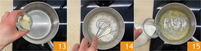 Mientras tanto, preparad la fondue: en un cazo de fondo grueso derretid la mantequilla a fuego lento 13, luego agregad la harina y mezclad con un batidor 14 hasta obtener una mezcla homogénea. Verted la leche caliente poco a poco 15.