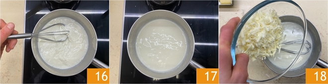 Continuad mezclando 16 hasta que la bechamel esté lisa y bien espesa 17. Apagad el fuego y añadid el Asiago rallado 18.