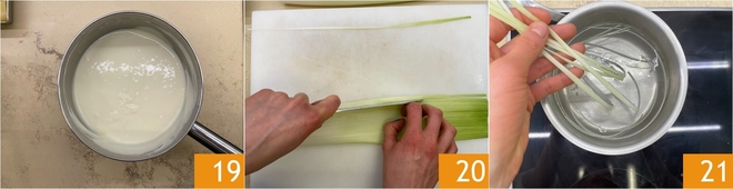 Mezclad hasta que se disuelva por completo 19. Ahora sacad del puerro unos hilos finos y regulares 20 y escaldadlos brevemente en agua hirviendo para ablandarlos 21.