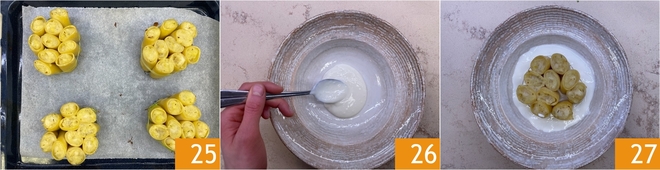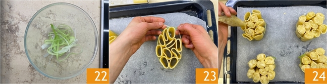 Escurrid los tallos y dejadlos enfriar 22. Estáis listos para montar el plato: en una bandeja forrada con papel de horno colocad los paccheri en vertical formando 4 montoncitos regulares de aproximadamente 10 piezas cada uno. Atad los paccheri con los tallos de los puerros 23. Transferid el relleno de patatas y bacalao a una manga pastelera sin boquilla y llenad los paccheri uno a uno hasta el borde 24. Poned la bandeja bajo el grill del horno y gratinad durante unos 5 minutos.