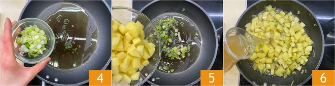 Calentad un chorrito de aceite en una sartén grande, agregad la cebolleta junto con las hojitas de tomillo 4 y dejad que se poche suavemente a fuego medio. Añadid las patatas 5, mezclad para sazonarlas y doradlas brevemente, luego cubrid con el caldo vegetal caliente 6.