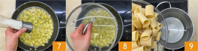 Sazonad con sal 7 y pimienta, cubrid con la tapa 8 y cocinad durante unos 15 minutos. Ahora llevad a ebullición abundante agua con sal y coced los paccheri al dente 9, teniendo cuidado de no romperlos.