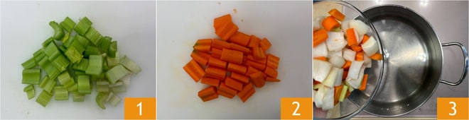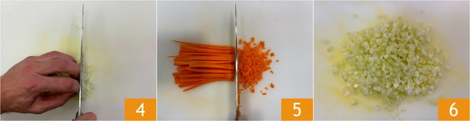 Mientras tanto, picad finamente la cebolla 4, la zanahoria 5 y el apio 6.