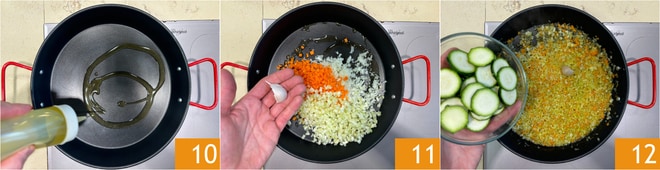En una sartén grande (mejor si es una paellera) verted un chorrito de aceite 10 añadid cebolla, ajo y zanahoria. Añadid también un diente de ajo entero 11 y sofreíd durante unos minutos. Luego añadid también los calabacines 12.