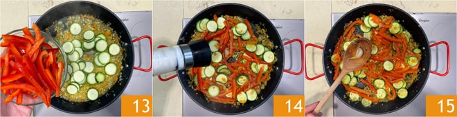 Añadid los pimientos 13 y ajustad de sal y pimienta 14. Cocinad durante unos minutos, hasta que las verduras estén ligeramente pochadas. Eliminad el ajo 15.