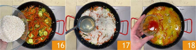 Añadid el arroz 16 y tostádlo, mezclando bien, durante 2 minutos. Mojad con el caldo vegetal 17 en cantidad suficiente para cubrir todo el arroz. Mientras tanto, disolved el azafrán con un poco de agua o caldo y añadidlo a la sartén 18.