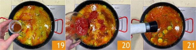 Añadid también la paprika 19 y el puré de tomate 20. Ajustad de sal y pimienta 21
